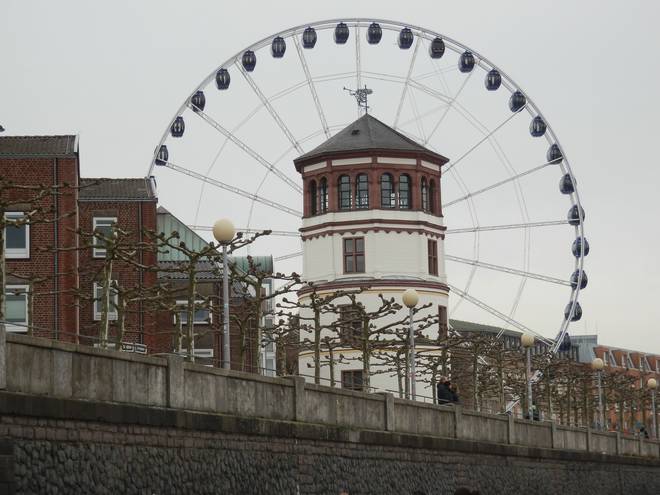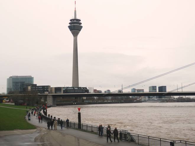 Rheinufer Rheinturm Rheinkniebrücke Apolloweise Rhein |