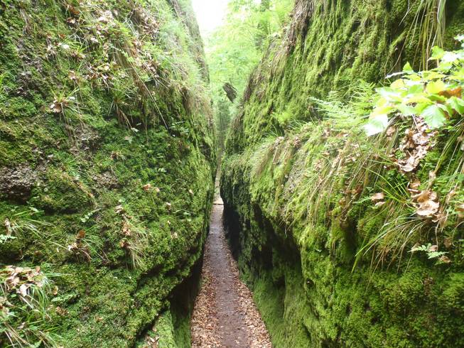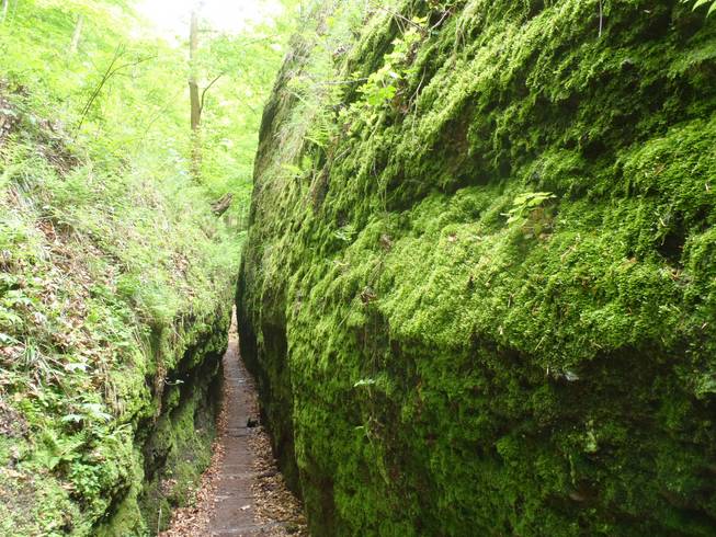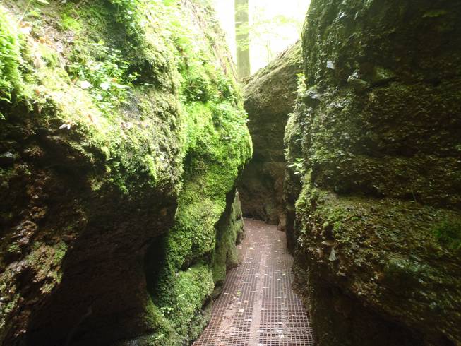 Drachenschlucht Das dürfte wohl die engste Stelle (68 Zentimeter) sein. Da erstaunt er schon etwas, daß man zwar vor der Mit-nahme von Kinderwagen, Wollstühlen, Rollatoren, Fahrrädern warnt und bewegungseingeschränkten Personen ganz vom Betreten abrät, aber keinerlei Hinweis für etwas besser genährte Leute raus gibt. |