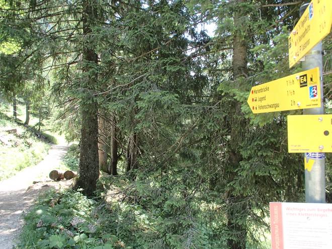 Tegelberg 14.10 Uhr Und los ging es. Da auf den Schildern der "Gelbe Wand Kletterstieg" gesondert neben der Marienbrücke aufgeführt war wies darauf hin, daß ich um den Selbstmordkurs, den man von der Tegelbergbahn hatte sehen können herum kam. |