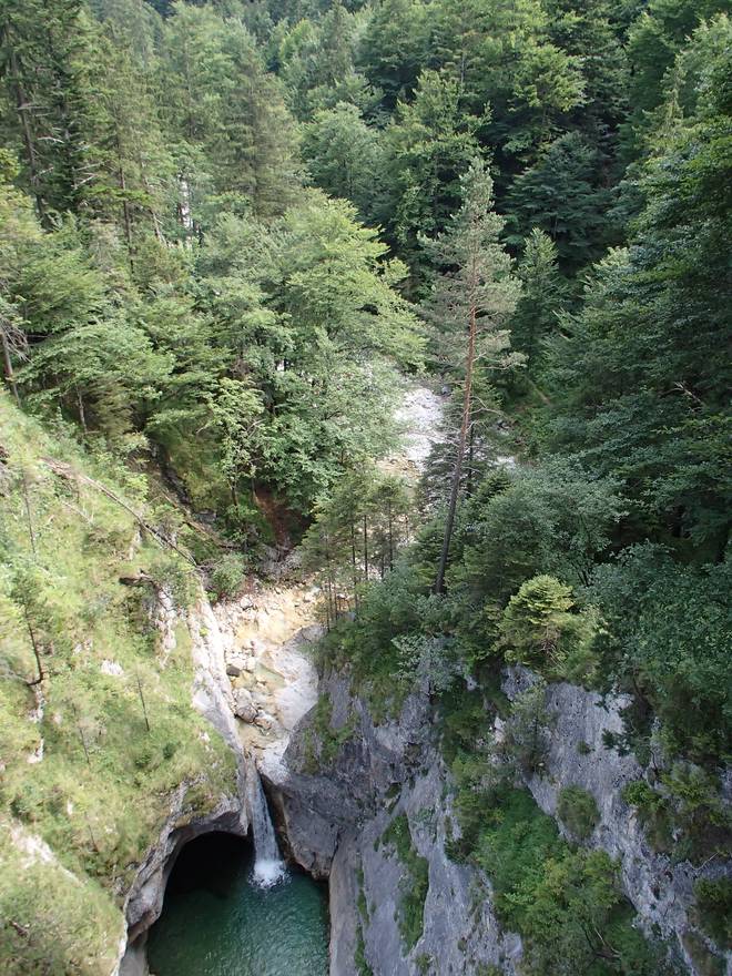 Pöllatschlucht Und gerade die Pöllatschlucht konnte man nur von hier einsehen, weil der Weg durch die Schlucht gerade gesperrt war. Wie so vieles im Sommer 2015 gerade gesperrt war in der Gegend... |