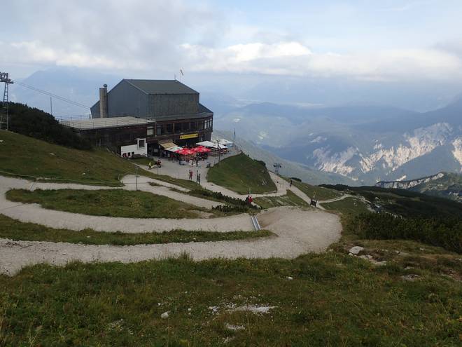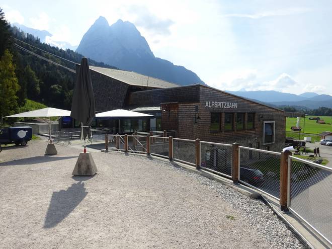Alpspitzbahn (Berg-Station) 16.10 Uhr Der Gipfel der Alpspitze ist nicht hier. Der liegt nicht nur weiter südlich, sondern auch noch 595 Meter höher. Ich holte mir noch etwas zu trinken, war auf dem Klo und packte meinen Rucksack für den Lauf fertig. |