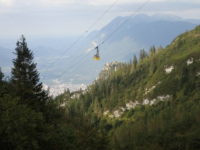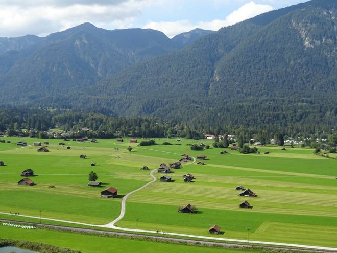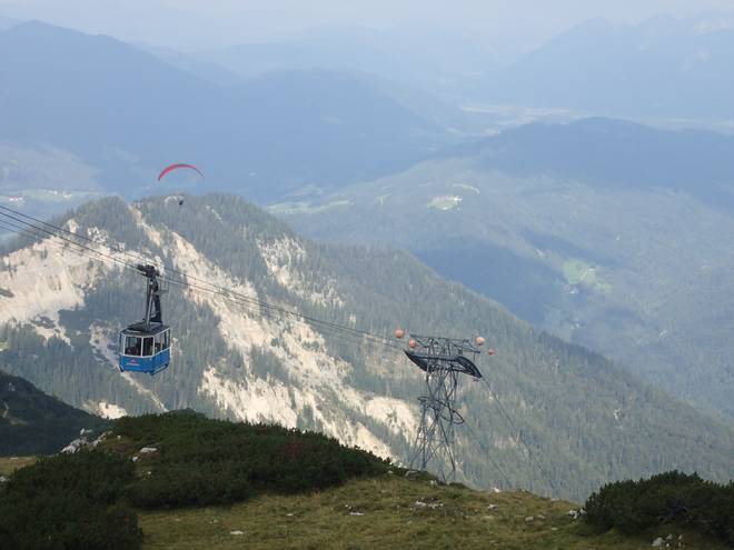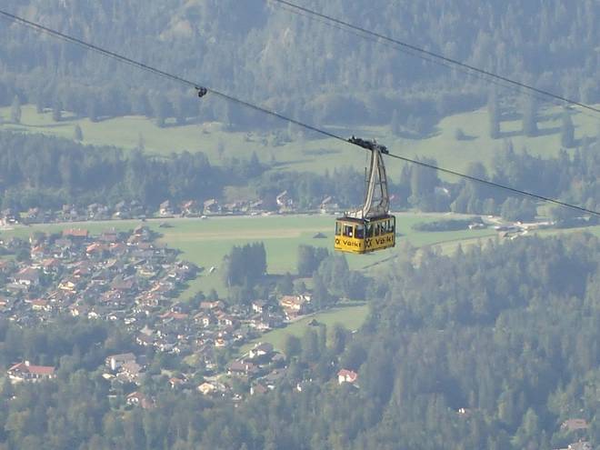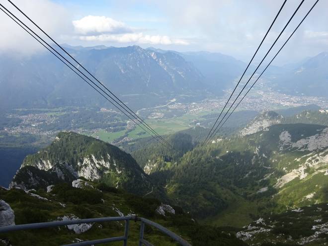 Alpspitzbahn 15.43 Uhr Von 748 Metern Höhe ging es rauf auf 2033 Meter. Da unten durch die Hütten der Ofelwiesen würde ich später noch laufen. |