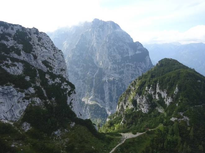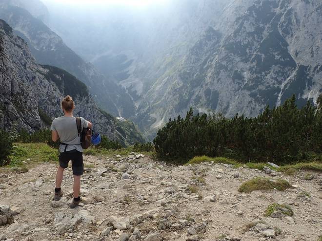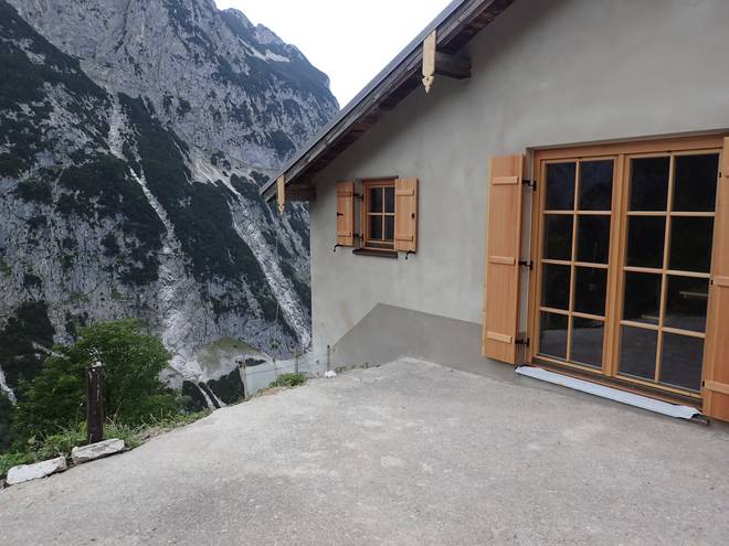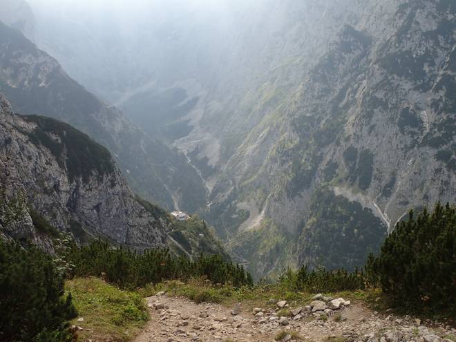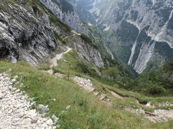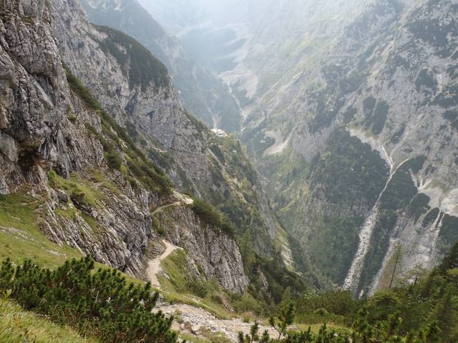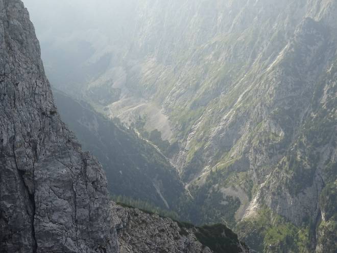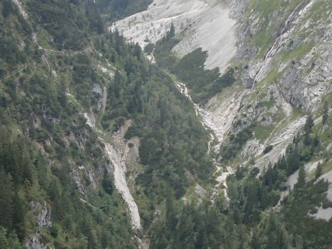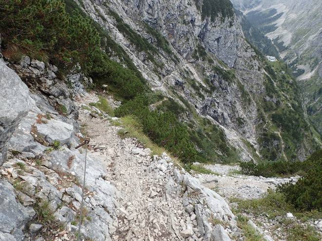 Richtung Knappenhäuser Einmal kurz auf dem Geröll ausgerutscht und schon wäre ich ein roter Fleck da unten im Höllental. |