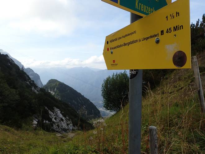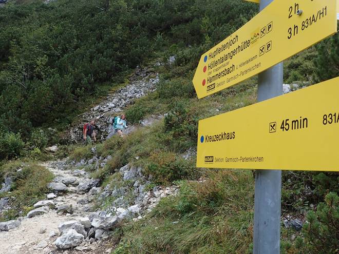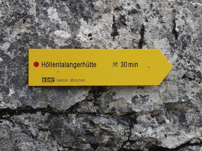 Richtung Knappenhäuser 17.29 Uhr Höllentalangerhütte in nur 30 Minuten?? 32 Minuten zuvor waren es noch zwei Stunden. Natürlich sind Zeitangaben im Gebirge relativ, aber ich war bestimmt niemand, der fast dreimal so schnell unterwegs war wie der Durchschnitt. |