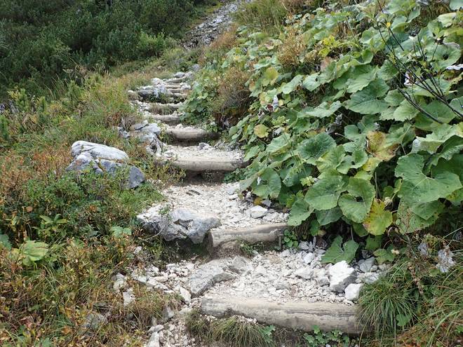 Richtung Längenfelderkopf Verkürzt man die Strecke von 3080 auf 750 Meter. dann wird es mehr als vierfach steil. Das wurde zum Teil durch Stufen ausgeglichen. |