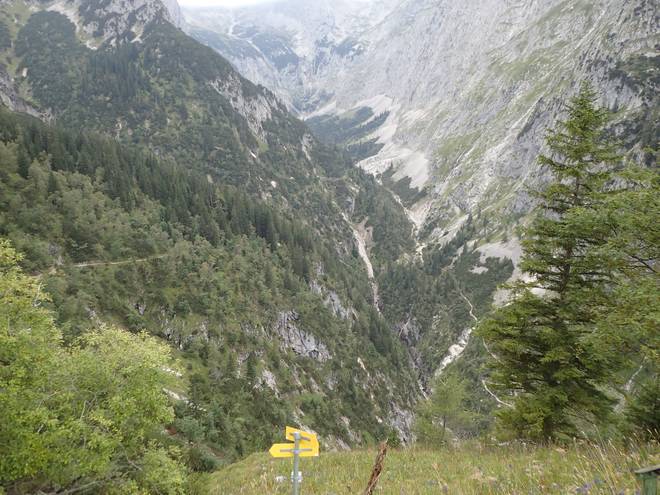 Hupfleitenjoch 16.59 Uhr Das Hupfleitenjoch hatte ich erreicht. 1770 Meter Hoch. Das Höllental dort unten lag 550 Höhenmeter tiefer. |