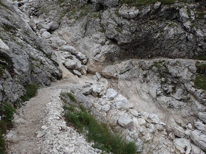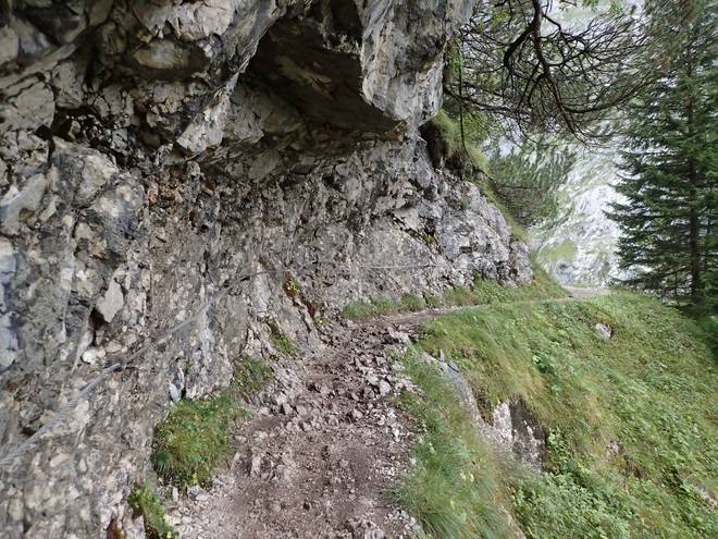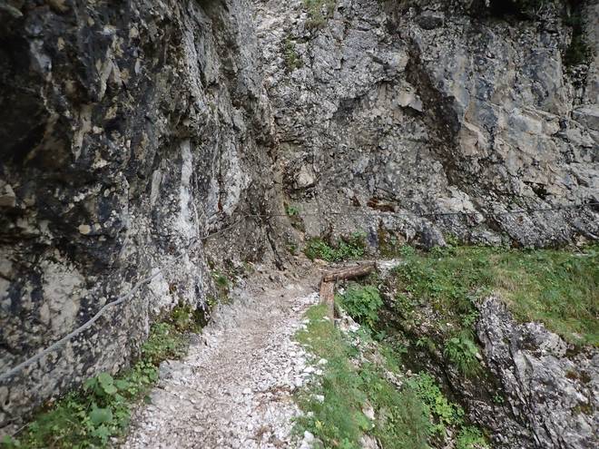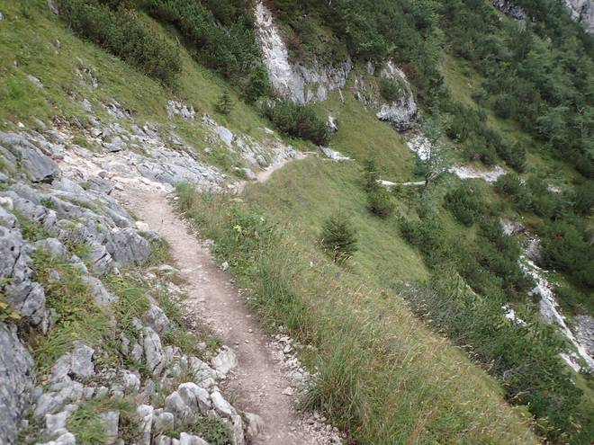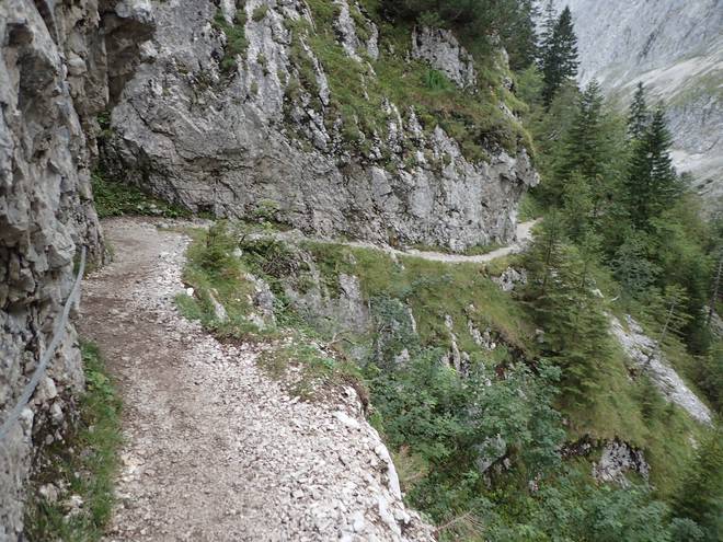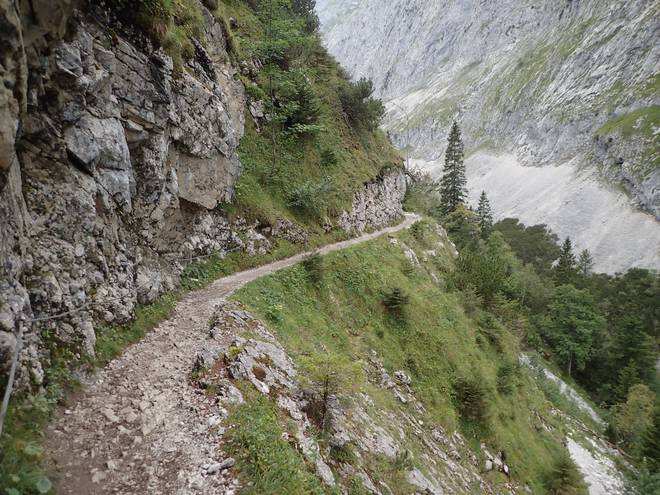 Richtung Höllentalangerhütte Es war noch nicht lange her, daß ich mich nur an einem Stahlseil einen Abhang ohne Weg entlang hangeln mußte. Hier fehlte das Stahlseil. |