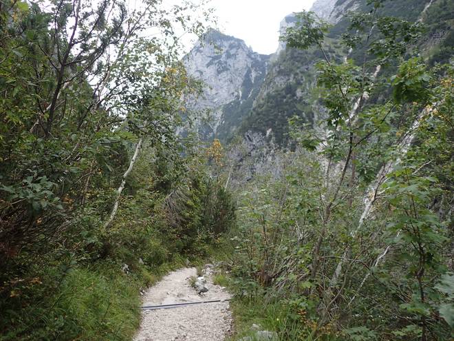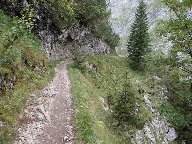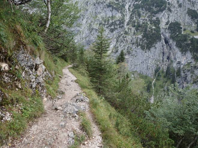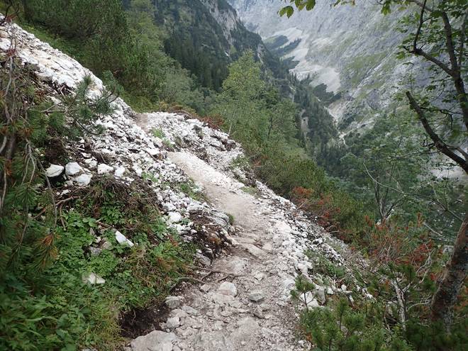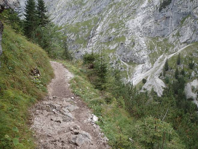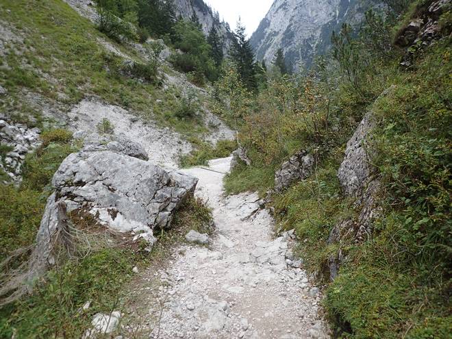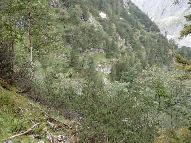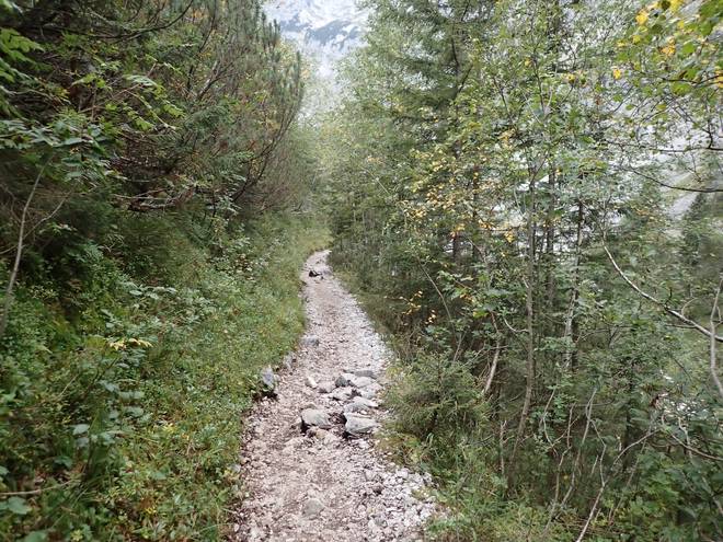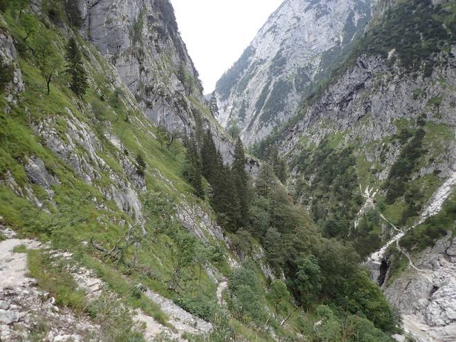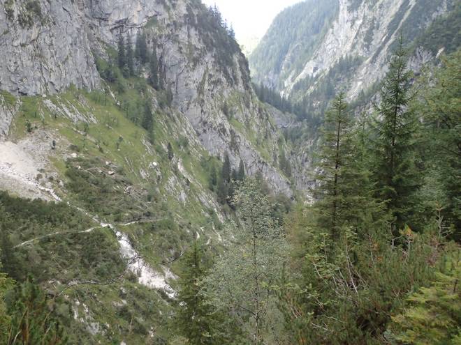 Richtung Höllentalangerhütte Die ersten Bäume auf meiner Strecke. Das würde etwas die Absturzgefahr mindern. |