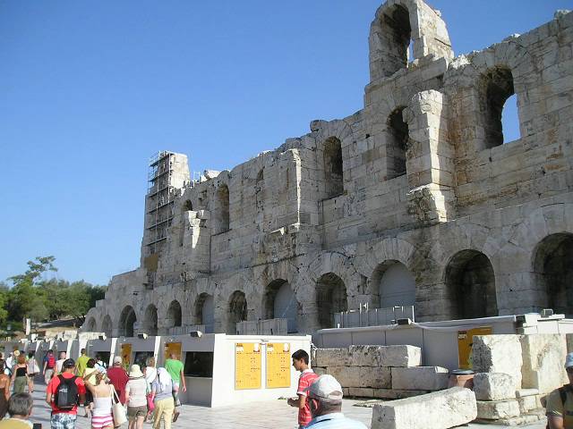Anmarsch zur Akropolis. Hier die Rückwand des Theatro Irodou Attikou. |