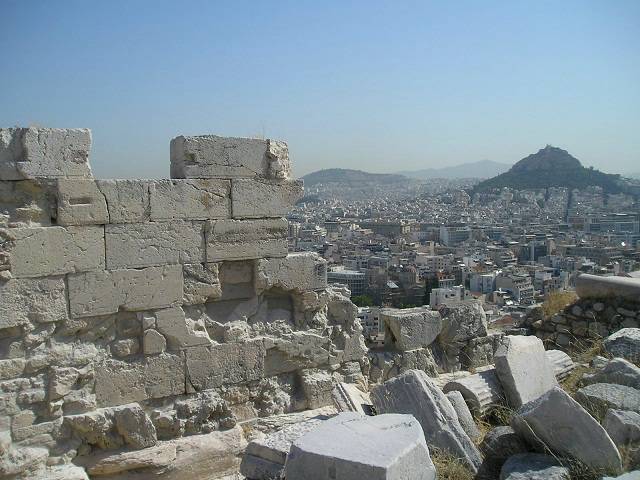 Ruinen auf der Akropolis / Blick auf den Likavittos (Hügel von Lycabettus) |