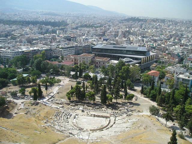 (Dionysostheater) / Odion Perakléous (Pericles Odeium) / Mouseio Akropoleos (Akropolis-Museum) / Süd-Süd-West-Blick über Athen |