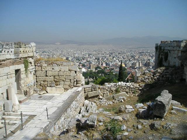 Blick über die Mauer des Theatro Irodou Attikou über Athen (Südblick) |