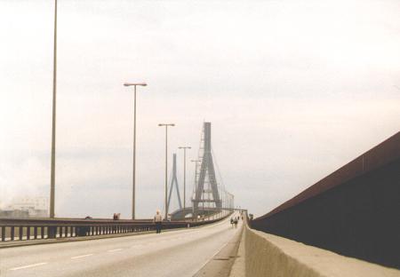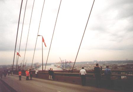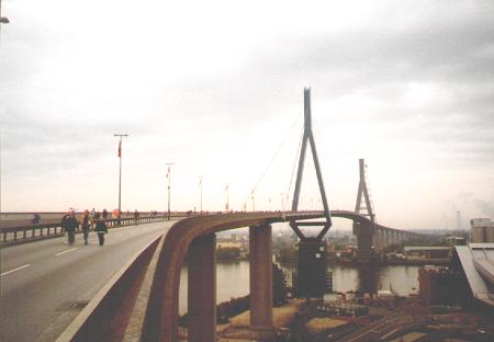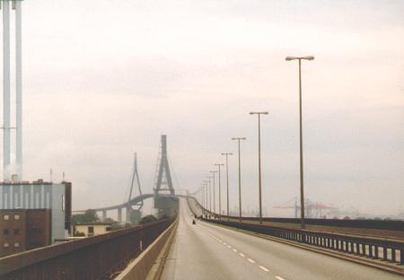 Am 26.09.1974 wurde die Köhlbrandbrücke im Hamburger Hafen eröffnet. Die 1970-74 erbaute Hängebrücke über dem Elbarm Köhlbrand ist 3940 Meter lang und dient ausschließlich dem Auto- und LKW-Verkehr. Für Fußgänger und Radfahrer ist die Brücke gesperrt. Die Fahrbahn liegt 53 Meter über dem Wasser - wer dennoch einen Seitenblick riskiert, wird mit einer Aussicht über einen Großteil Hamburgs belohnt.