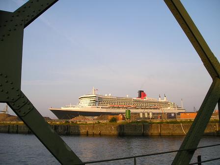 | Die "Queen Mary 2" von der Brooktorbrücke am Magdeburger Hafen | |