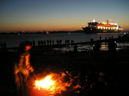 November 2005 17.29 Uhr Am Elbstrand bei Schulau Die "Queen Mary 2" taucht in der Ferne auf. Ein Feuer erleichterte ein wenig das Warten bei Minusgraden. |