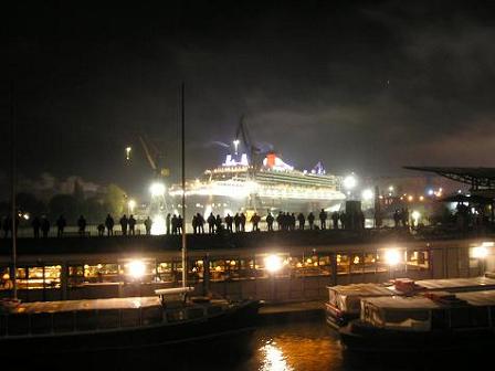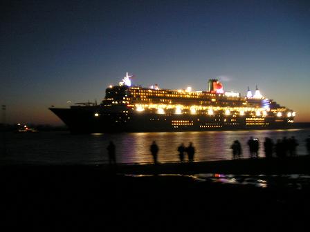 Das geplante Eindocken wurde wegen nicht aus- reichend Hochwassers auf den folgenden Morgen verlegt. Über Nacht blieb das Schiff am Kreuzfahrt- Terminal. |