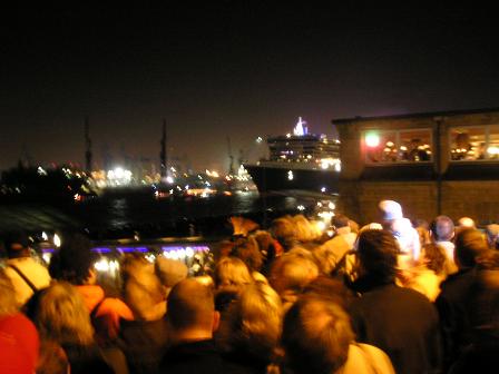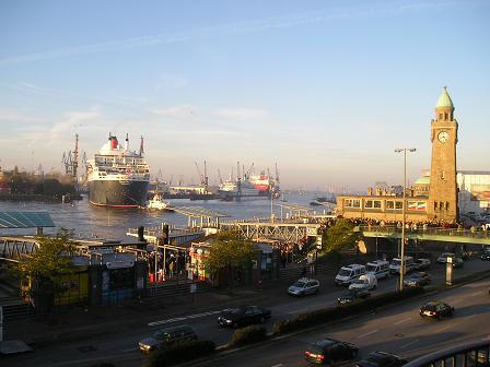 November 2005 15.20 Uhr Die "Queen Mary 2" ist von der ganzen Stadt aus sehr gut zu erkennen. Hier der Blick vom Kirchturm St. Nikolai. |