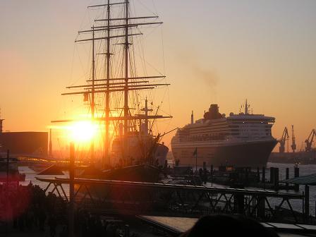 November 2005 7.48 Uhr Hamburg Landungsbrücken Im Sonnenaufgang macht sich die "Queen Mary 2" auf den Weg ins Dock 17 von Blohm & Voss. |