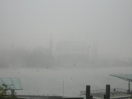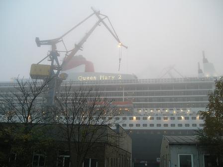 November 2005 15.21 Uhr Hamburg Landungsbrücken Die "Queen Mary 2" im dichten Hamburger Nebel. |