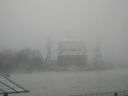 Aber selbst im Nebel ist gut zu erkennen, wie das Schiff sogar umliegenden Kräne überragt. |