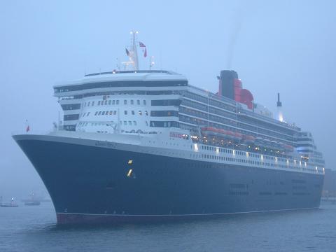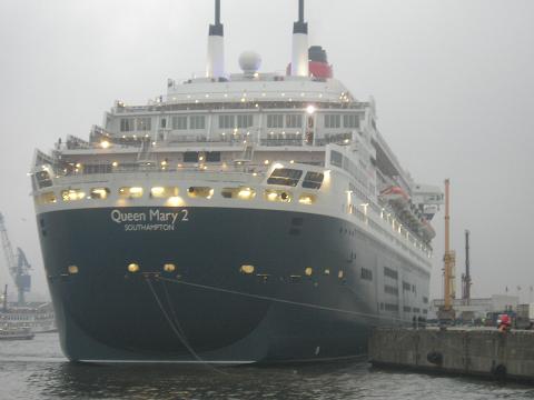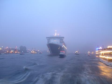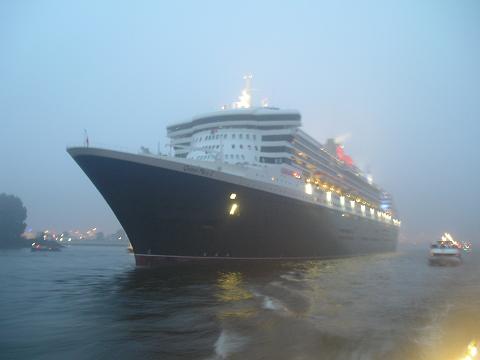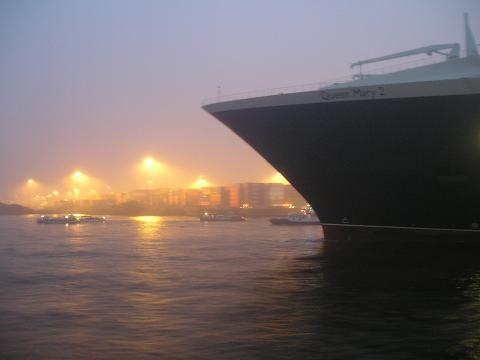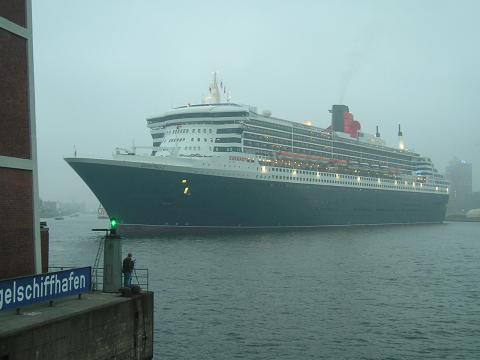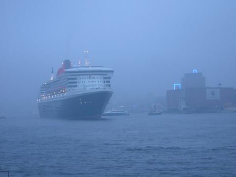 Im Morgennebel war die "Queen Mary 2" aufgetaucht und glitt nun langsam den Hafen entlang. |