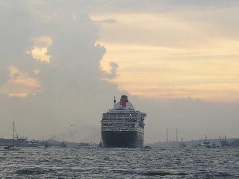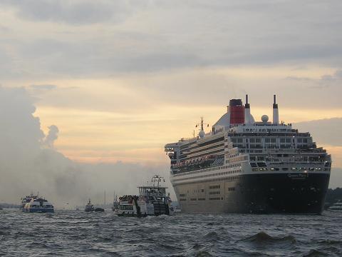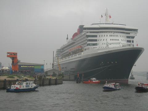 | Noch eine schöne Komplett- ansicht der "Queen Mary 2". Davor machen sich die Begleitboote bereit. | |