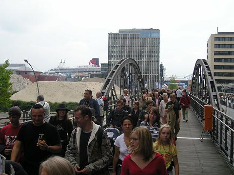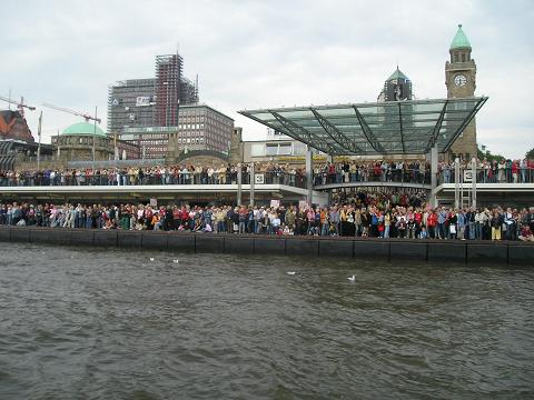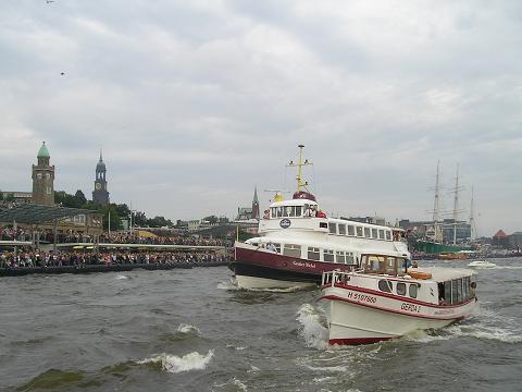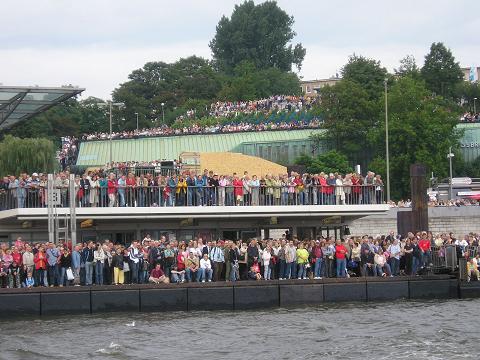 | Vorbeifahrt an den Landungs- brücken. Vor allem zwischen den Barkassen gab es einen harten Kampf um die besten Plätze. | |