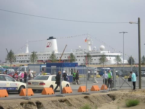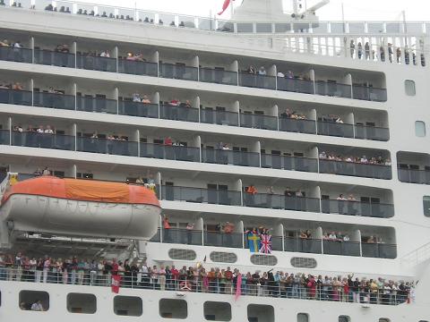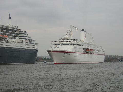 | Hinter der "Queen Mary 2" liegt diesmal die "MS Deutschland", unser ZDF- Traumschiff. Leider von hier nicht sehr gut zu sehen. | |