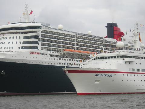| Neben der "Queen Mary 2" wirkt die 171 Meter lange "MS Deutschland" (das größte Schiff unseres Landes" wie ein Beiboot. | |