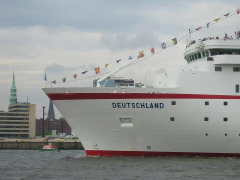 Die "MS Deutschland" verläßt als erstes der beiden Schiffe den Hafen |
