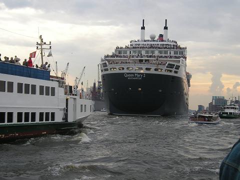 Queen an und verließ uns abends um 18.15 Uhr. Und endlich schaffte ich es, auf eines der Begleitboote auszuspringen, die die "Queen Mary 2" immer die Elbe auf und ab begleiten. |