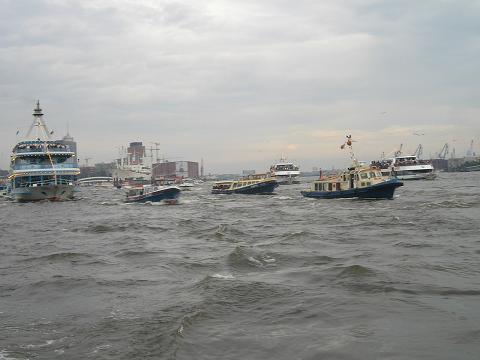 | Auf Höhe Finkenwerden drehten dann auch viele der Begleit- boote um und nahmen Kurs auf den Hafen | |