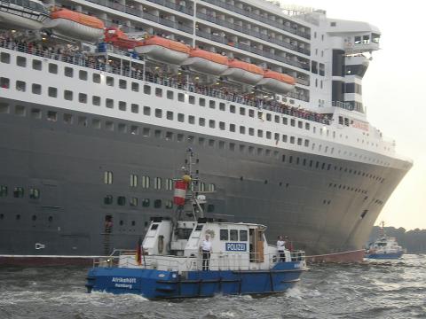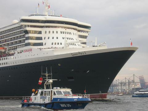 | Näher ran durften wir leider nicht. Denn während sich die Barkassen gegenseitig fast rammten, wurde die "Queen Mary 2" bestens bewacht. | |
