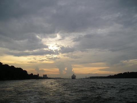 Langsam fährt die "Queen Mary 2" die Elbe hinauf auf dem Weg Richtung Nordsee und dann Southampton und New York |