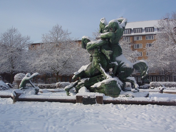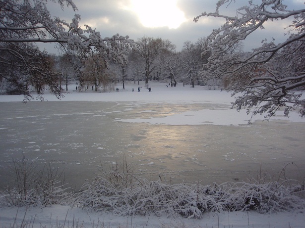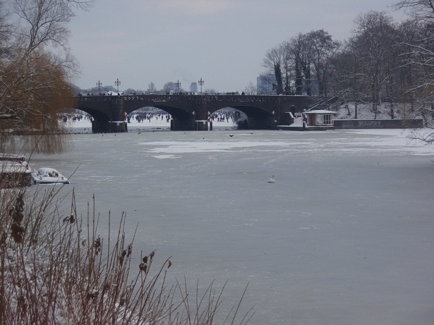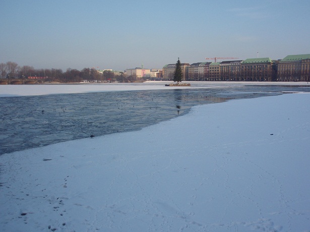 Binnenalster mit dem festgefrorenen Tannenbaum (Blick von der Ecke Neuer Jungfernstieg / Jungfernstieg) |