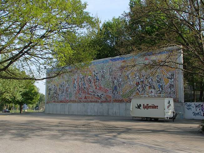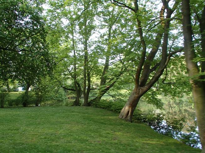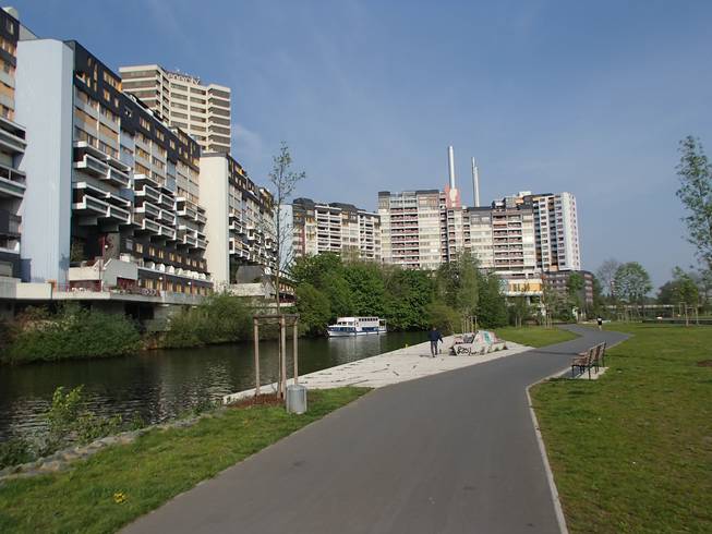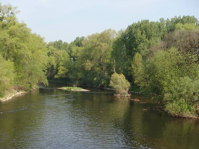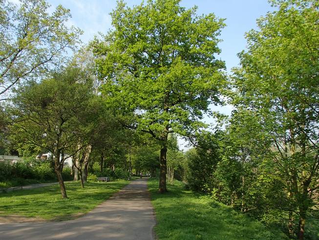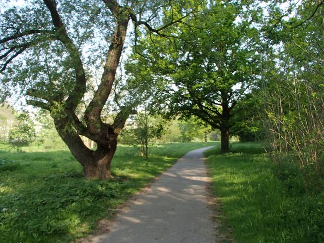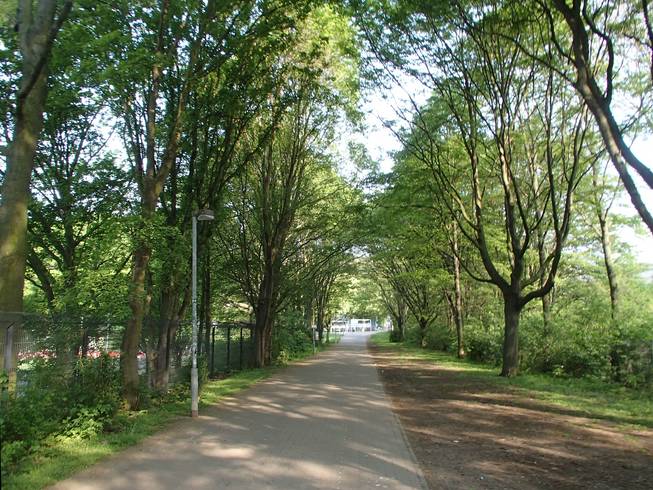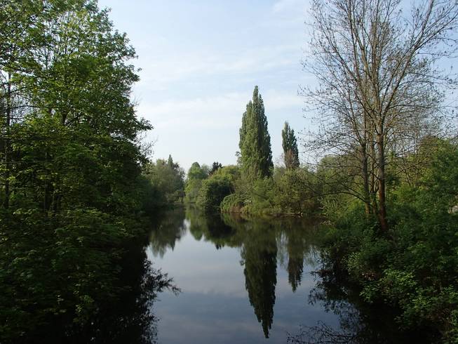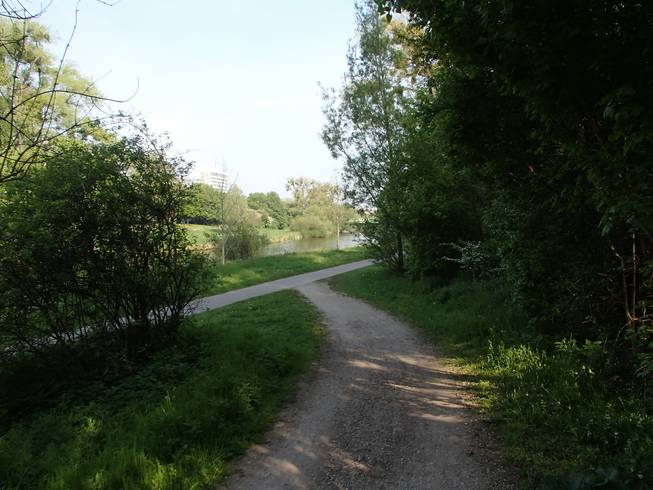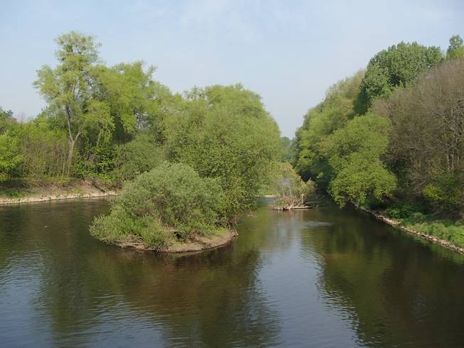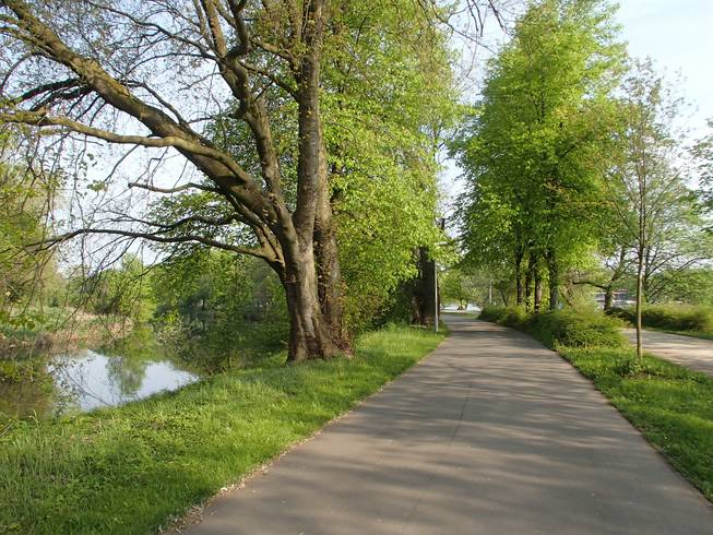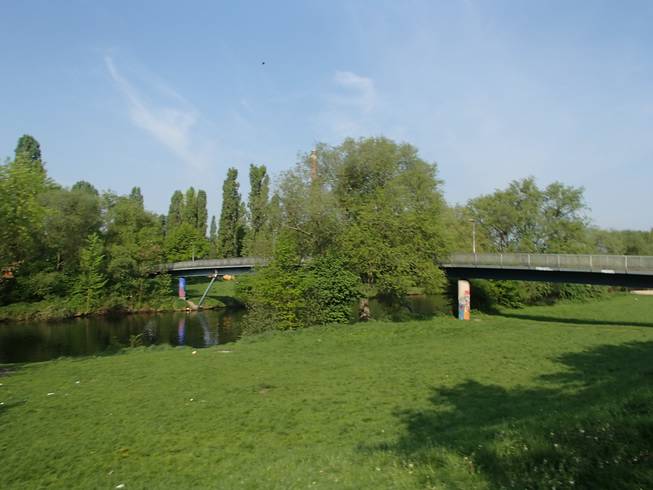 Clara-Zetkin-Weg Der erste Besuch an der Leine (rechts hinter den Bäumen). |