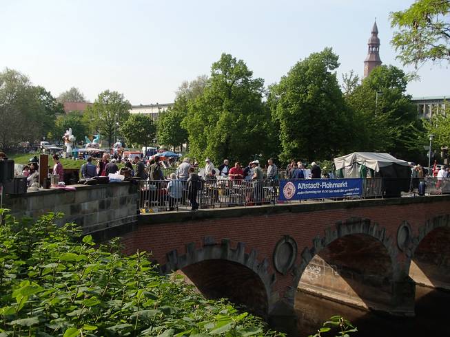 Leine / Marstallbrücke Hier verhinderte der jeden Samstag stattfindende Altstadt-Flohmarkt das Weiterlaufen an der Leine. |
