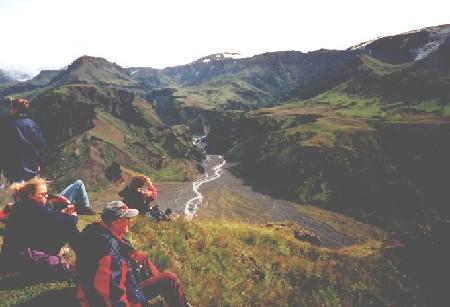 Wandergruppe auf dem Valahnukur - Blick in die Schlucht Hvannargil |