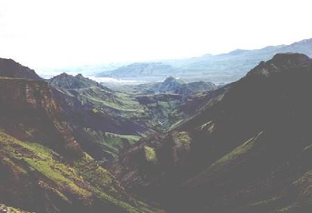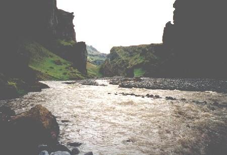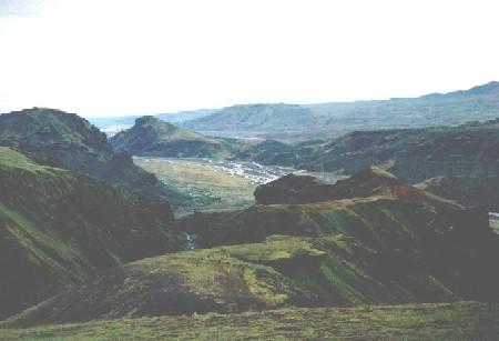 Der schönste Ausblick auf Island: Fluß Krossa (links), Schlucht Hvannargil (rechts) - Blick vom Valahnukur |