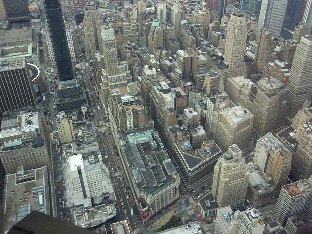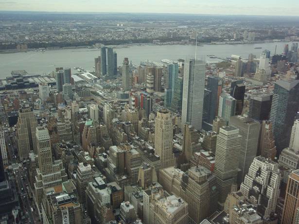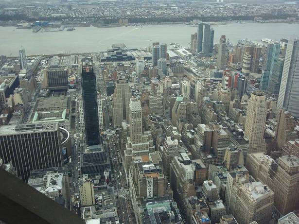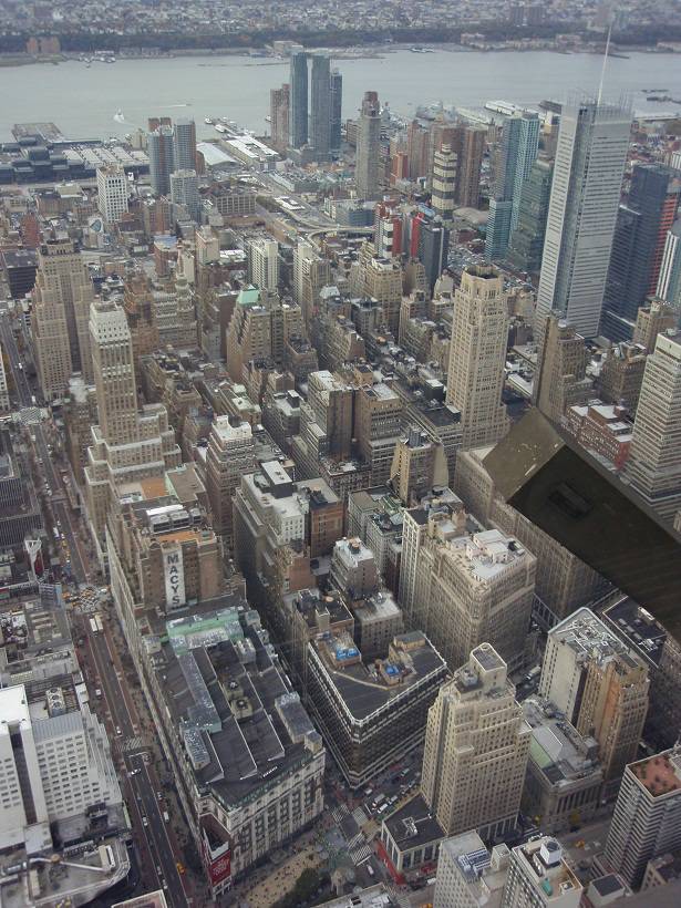 Blick Nord-West: Harald Square / Macy's / Jacob Javits Convention Center / Silver Towers / New York Times Building / Hudson River / New Jersey |