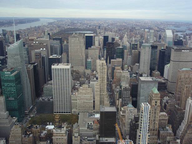 Blick Nord-Nord-Ost: Bank of America Tower / Hudson River / Upper West Side / Central Park / Rockefeller Center / Trump Tower / CityCorp Center / East River |
