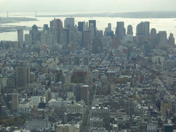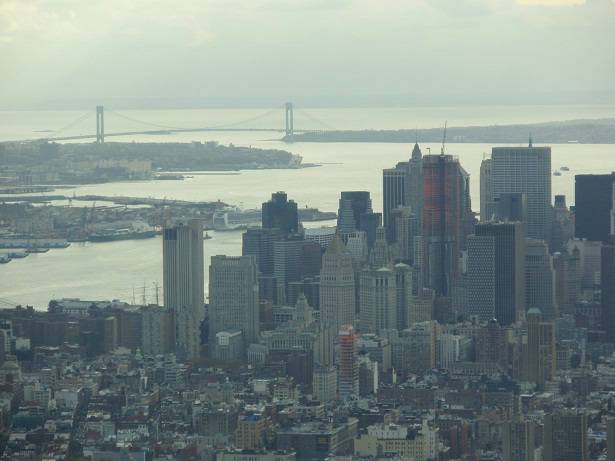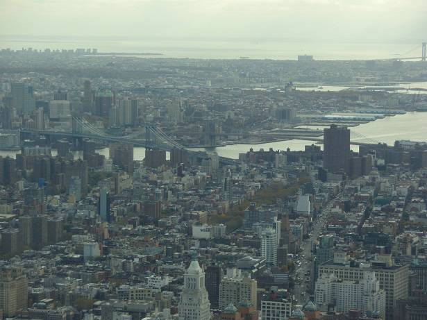 Blick Süd: East River / Manhattan Bridge / Brooklyn Bridge / Queens / Verrazano Narrows Bridge / Rockaway Beach / Altantic Ocean |