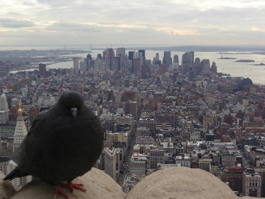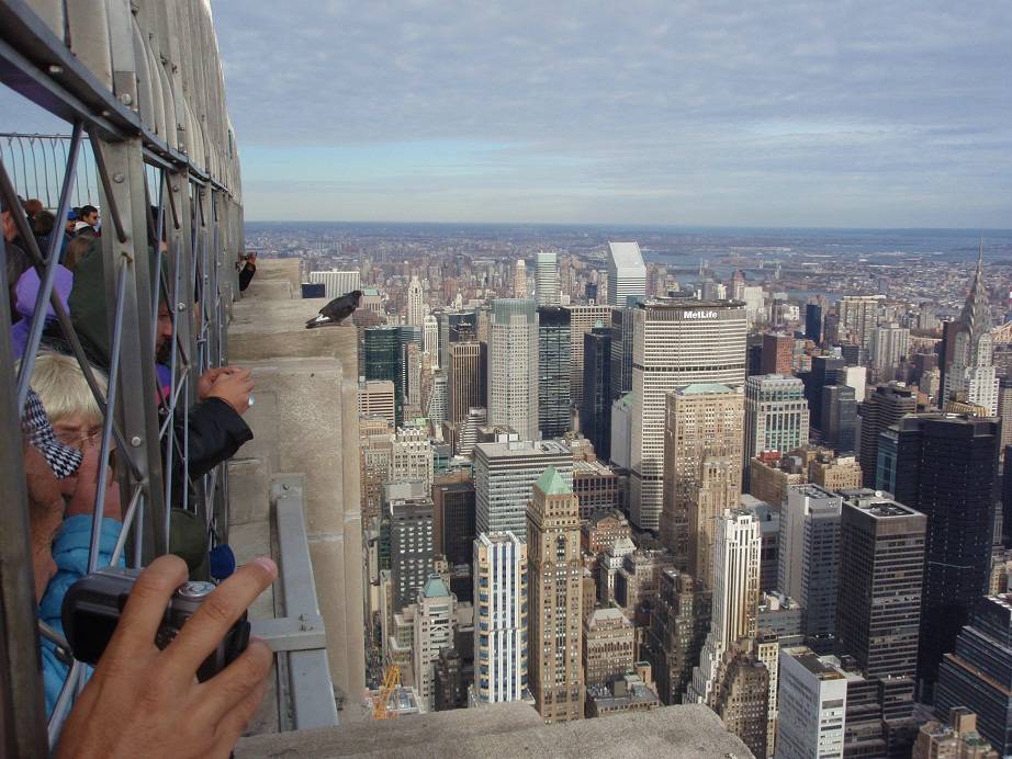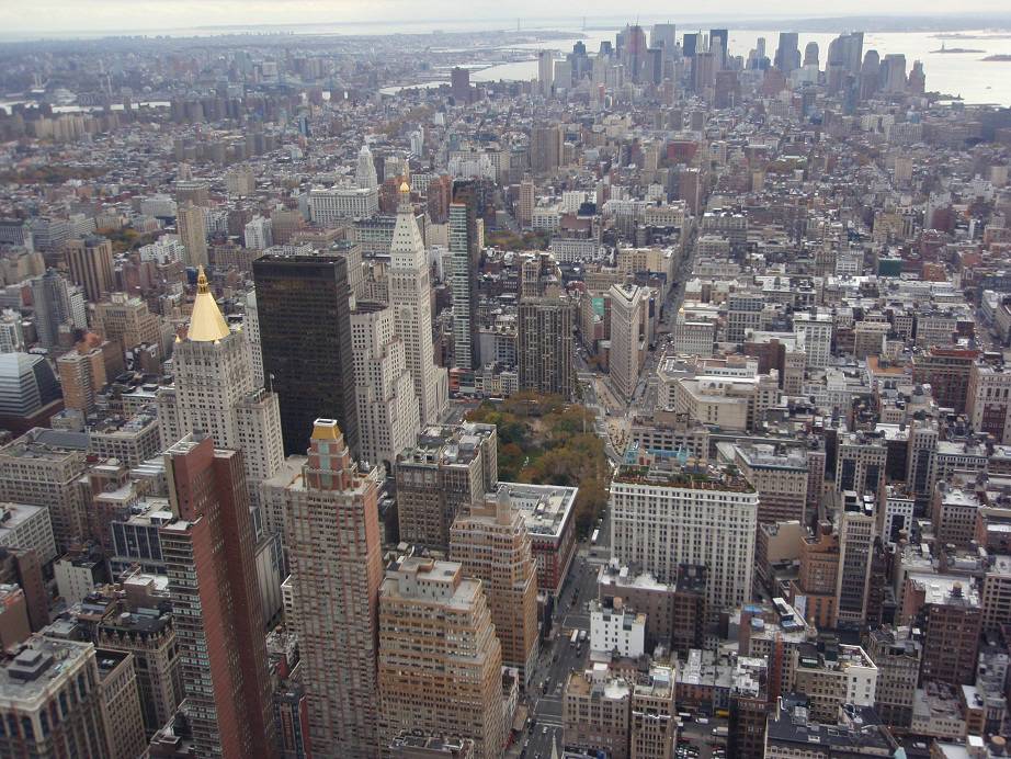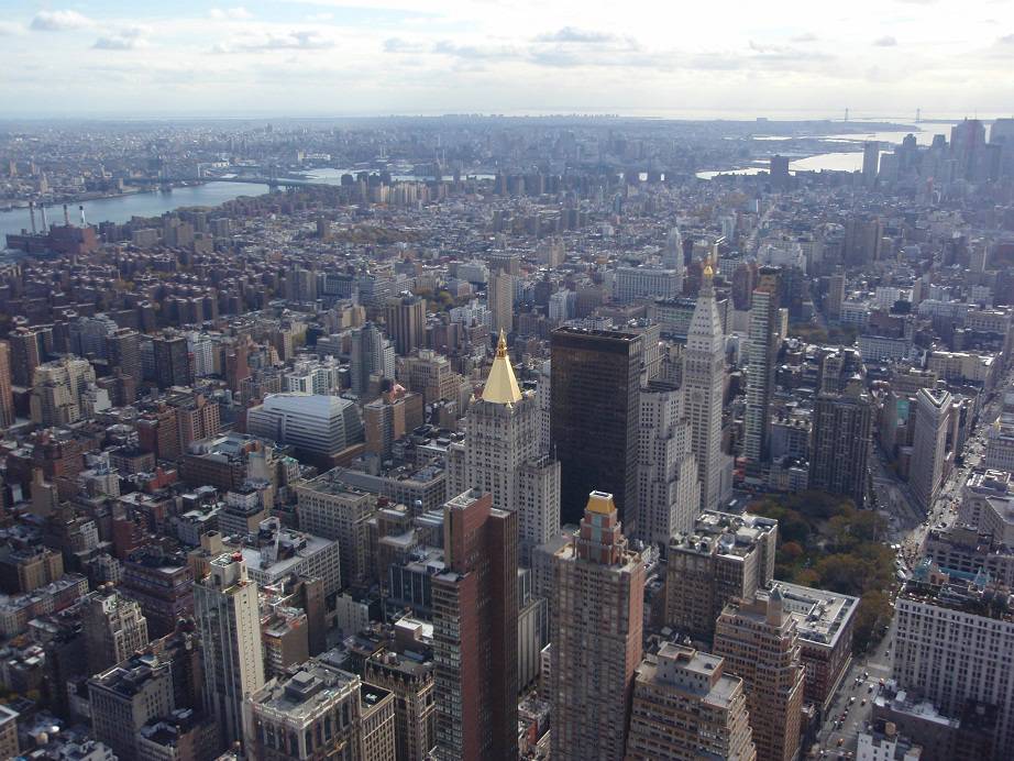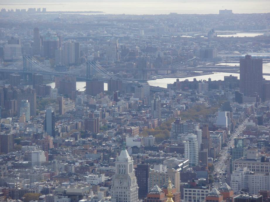 Blick Süd: East River / Williamsburg Bridge / Manhattan Bridge / Brooklyn Bridge / Verrazano Narrows Bridge / The Narrows / Downtown Manhattan / New York Life Building / The Metropolitan Life Tower / Madison Square Park / Flatiron Building |