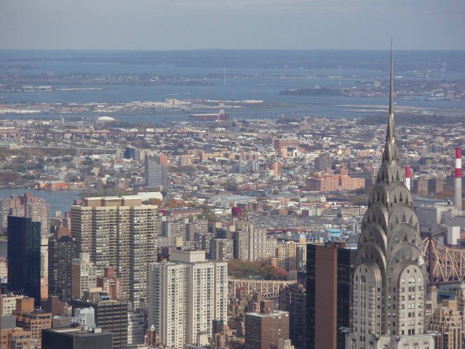 Blick Nord-Ost: East River / Bronx-Whitestone Bridge / La Guardia Airport / Queens / Chrysler Building / Queensboro Bridge |