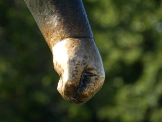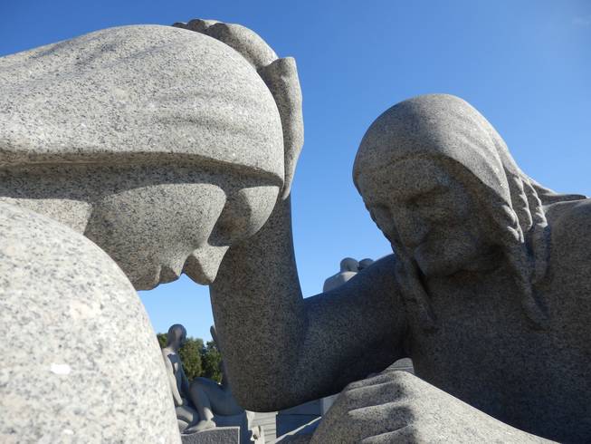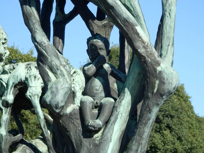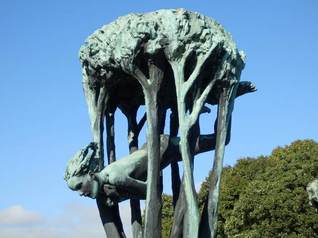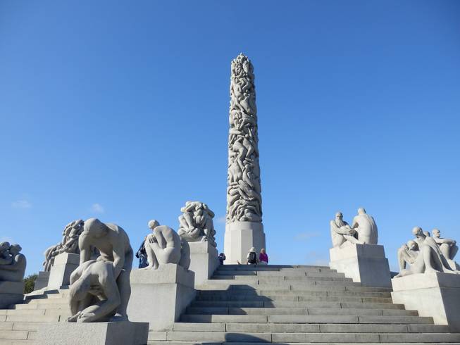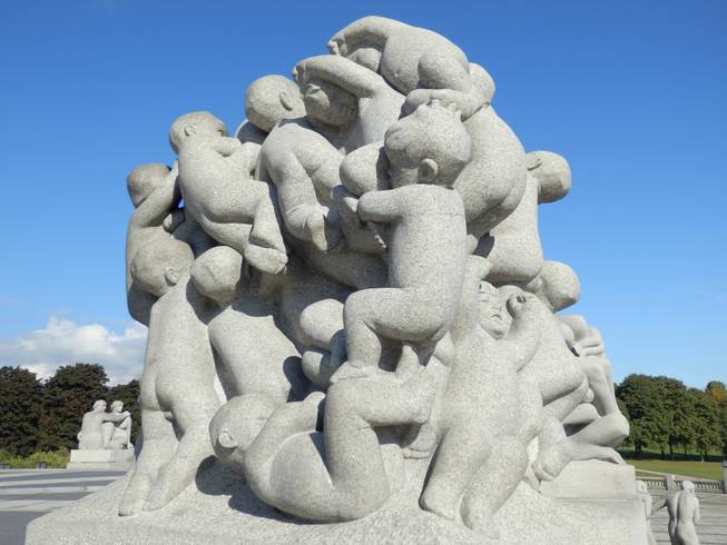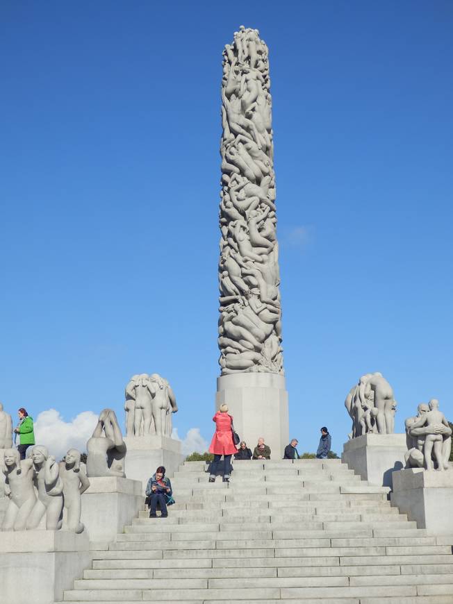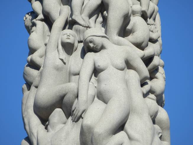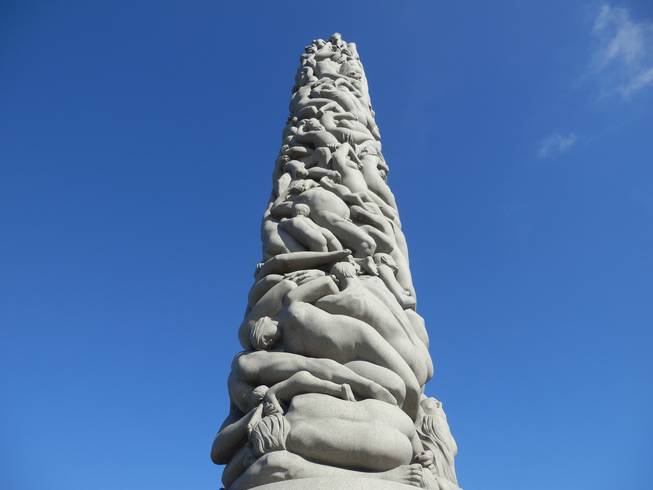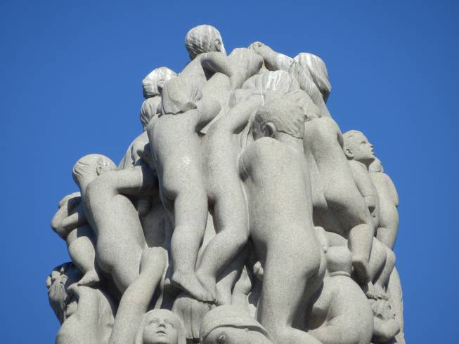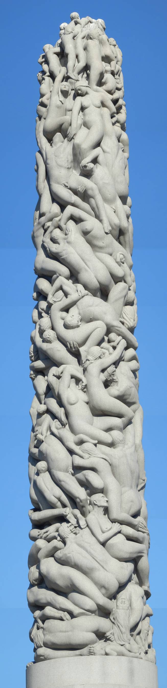 Monolitten, 1924-25. Granitt På Vigelandsparkens høyeste punkt står den drøyt 17 meter høye Monolitten, en søyle bestående av 121 figurer, hugget ut av én eneste granittblokk - derav navnet . Mens det melankolske grunntemaet i fontenen er det evige kretsløp, gir søylen rom for en helt annen tolkning, menneskets lengsler og streben etter det overjordiske og guddommelige. Er søylen rett og slett å forstå som en oppstandelsesvisjon? Menneskene suges oppover mot himmelen, her spores vemod og behersket fortvilelse, men også henrykkelse og håp. Dessuten mye samfølelse menneskene imellom. Varsomt støtter man hverandre og holder hverandre fast i denne forunderlige salighetsfølelse og oppdrift fra jordelivet. |