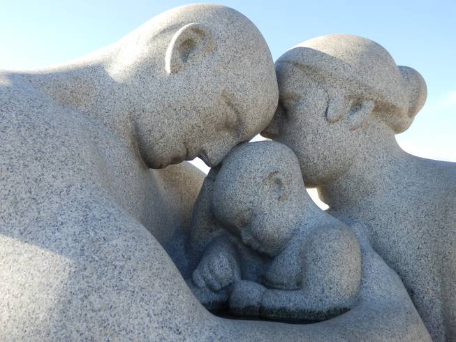 Mann og kvinne med lite barn mellom seg, 1917. Granitt |