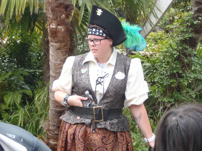 Pirates of the Caribbean, Adventureland Nett gekleidete Piratin, die einem in vielen Sprachen von der geschlossenen Attraktion erzählt. |