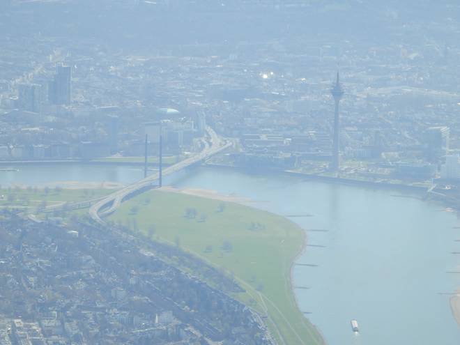20. März 2014 11.35 Uhr Rheinkniebrücke / Rheinturm / Rhein / Düsseldorf Abflug über die Innenstadt von Düsseldorf. Endlich mal was zu sehen. |