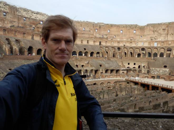 23. März 2014 07.51 Uhr Colosseo Und wieder Kolosseum. Diesmal vor dem Start zum Maratona di Roma. |