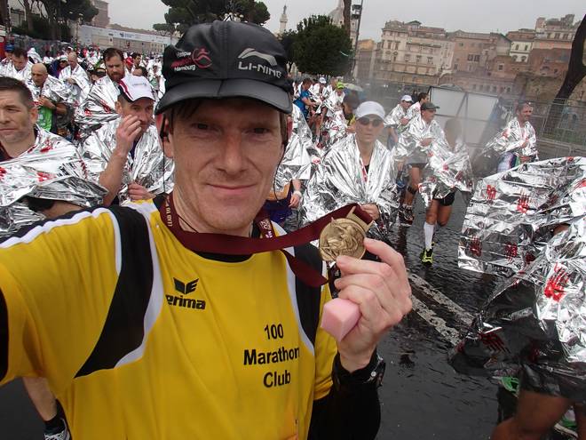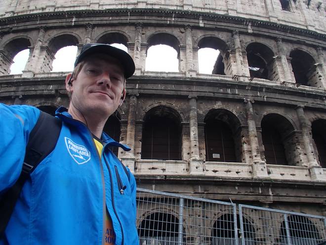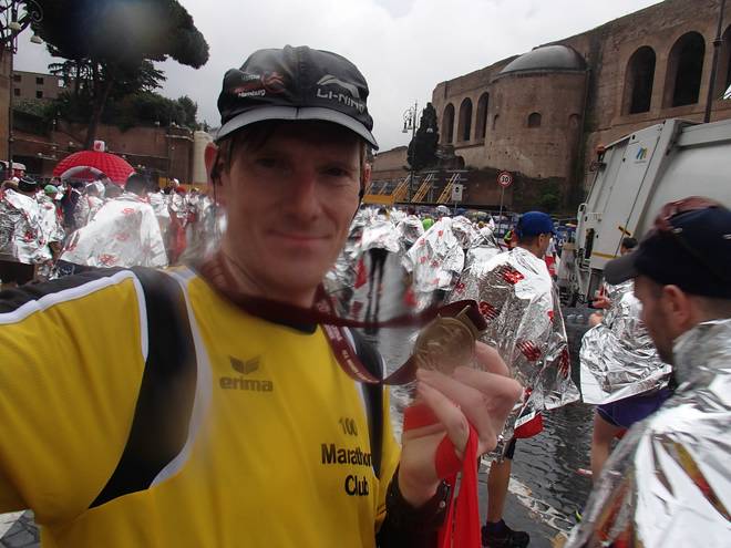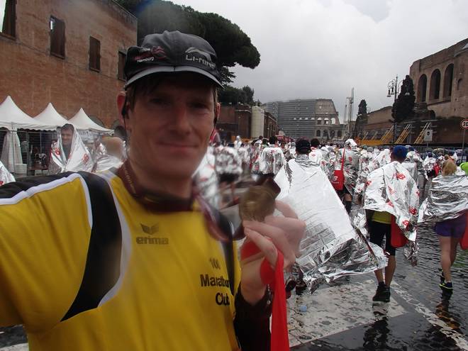 23. März 2014 12.56 Uhr Via dei Fori Imperiali / Chiesa del Santissimo Nome di Maria al Foro Traian Im Ziel des Maratona di Roma. Im strömenden Regen. |